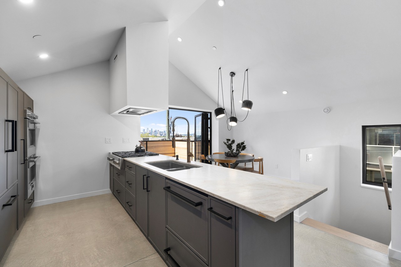 Chef’s kitchen and spacious living area with 150 sq ft deck/garden